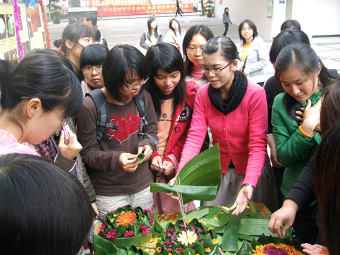 看到制作精美的水灯,许多人都好奇的过来询问,并且在做水灯的摊位上学习制作水灯的方法。泰语系学生热情礼貌,耐心的回答了同学们的问题,在一旁做示范,教他们如何制作精美的水灯。