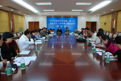 本网讯 为深入学习实践科学发展观,剖析我校学生工作状况,提高学生工作管理与服务水平,形成科学发展的新理念、新思路、新举措,12月3日,我校“学习实践科学发展观,进一步提高学生工作管理与服务水平”研讨会在南校区校行政楼第一会议室召开。校党委副书记许国彬,学生处、就业指导中心、校团委负责人,以及各学院分管学生工作负责人、辅导员代表出席了研讨会,学生处处长植秀聪主持会议。《思想教育研究》副主编毛殊凡博士也出席研讨会并发表讲话。