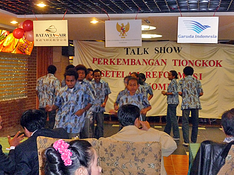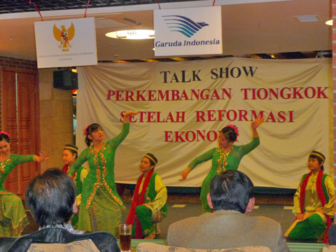 本网讯 11月30日晚,东语学院07级印尼-马来语班同学赴广州索多印尼餐厅参加了由印尼驻广州总领事馆组织、主题为“Perkembangan Tiongkok Reformasi Ekonomi”(经济改革后的中国发展)的广州印尼留学生联谊会成立四周年纪念活动。出席本次活动的有印尼驻广州总领事Harimauwan及其夫人、文化领事Arif Gunawan、广州各高校印尼留学生代表、我校东语学院印尼-马来语系系主任朱刚琴、副教授蔡金城及07级印尼-马来语班同学。