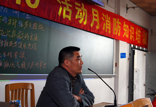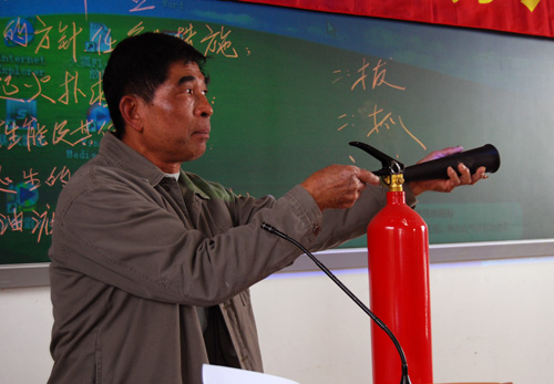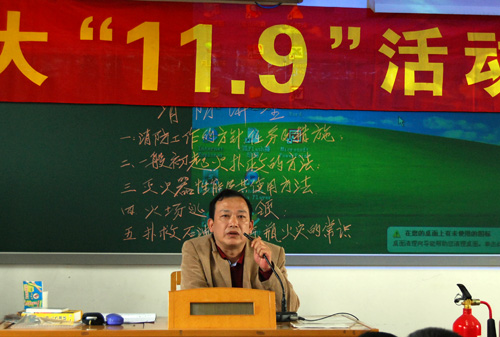 保卫处的江松林为大家做了题为《学习消防理论知识,提高自防自救能力》的讲座。他结合自己多年来的工作经验,向我们介绍了消防工作的方针、任务和措施;还结合实物操作讲述了灭火器的使用方法和火场逃生的基本原则。