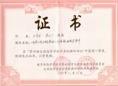 参赛作品分为七大类,我校省级精品课程《电路与电子技术基础》网络教学课件参与了竞争最为激烈的“计算机•教师教学辅导型”类角逐。该类共有15个参赛课件,由我校老师王金矿、李心广和张晶开发的《电路与电子技术基础》夺得该类中惟一的一等奖。来自教育部、国家科技部和国家人事部的领导为他们颁发了证书,并表示衷心的祝贺。