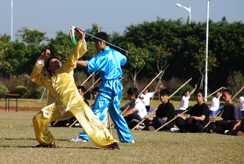 空翻、耍剑等高难度动作博得观众阵阵喝彩,醉剑、醉棍的表演更是神形兼备,齐齐为观众展现“醉里乾坤”。最后,整个表演方阵摆出“合一”两个大字,象征着中国传统文化中的天人合一思想,也代表了广外人南北同心。