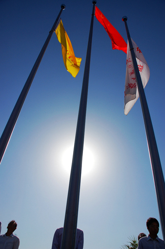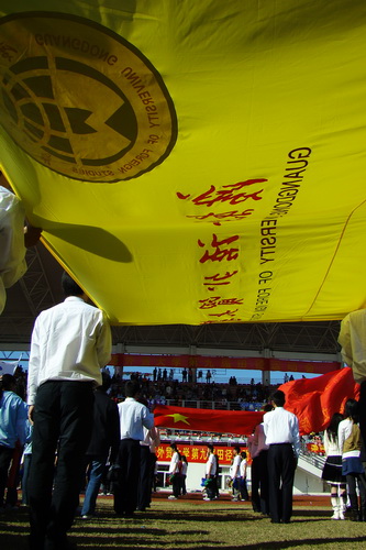 入场仪式结束后,升国旗,奏国歌;我校校旗以及校体育运动会会旗也在校歌《凤鸣岭南》的伴奏下冉冉升起。