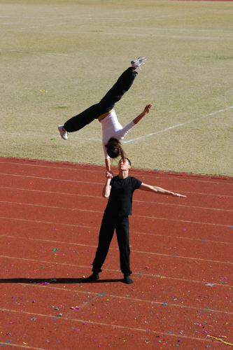 随之而来的是双人舞,vitas的经典歌曲缓缓回荡在运动场,“单手倒立”、“双腿悬空一字马”、“双人叠倒立”……表演者一系列精彩绝伦的高难度动作赢得了观众经久不息的掌声。