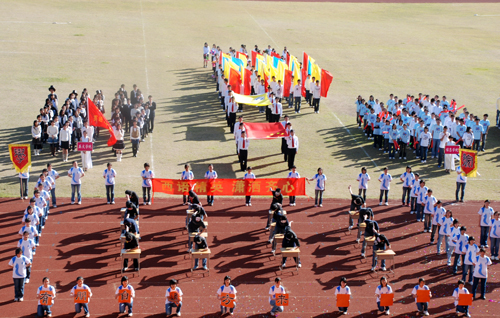 本网讯 11月28日,我校第九届学生田径运动会在南校体育场隆重开幕。在北京奥运会圆满举行的2008年里的校运会,必将显得更加的意义非凡。校长隋广军,党委副书记陈建平﹑许国彬,副校长方凡泉、董小麟、顾也力、陈子锐、仲伟合、刘建达等校领导,广外88届校友、武术协会名誉主席熊韶辉,各学院党政领导代表,体育运动委员会委员及嘉宾出席了本次开幕式。