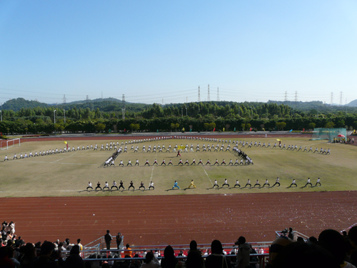 在西语学院方阵中,20多名头戴面具的男生用手有节奏地拍打着桌子,充满气势的动作和响亮的敲打声浑然天成,与奥运开幕式里千人敲鼓迎奥运那个激动人心的表演十分神似。而中文学院方阵也摆出了奥运五环的图案,使这次入场式的奥运气息更加浓厚。