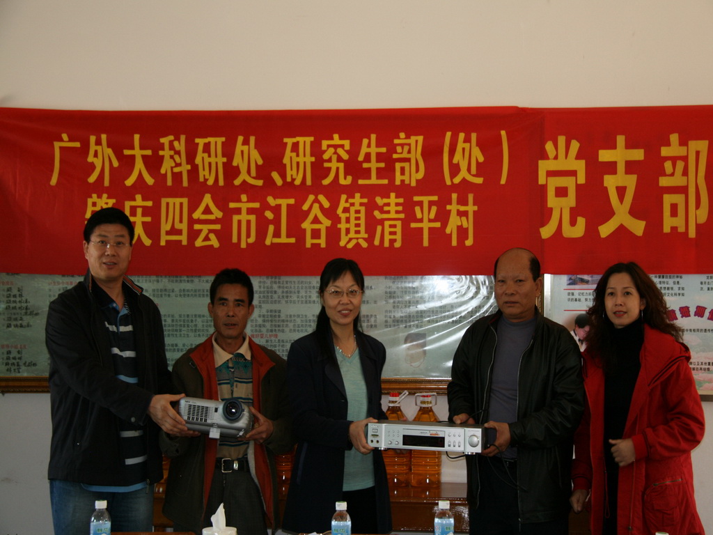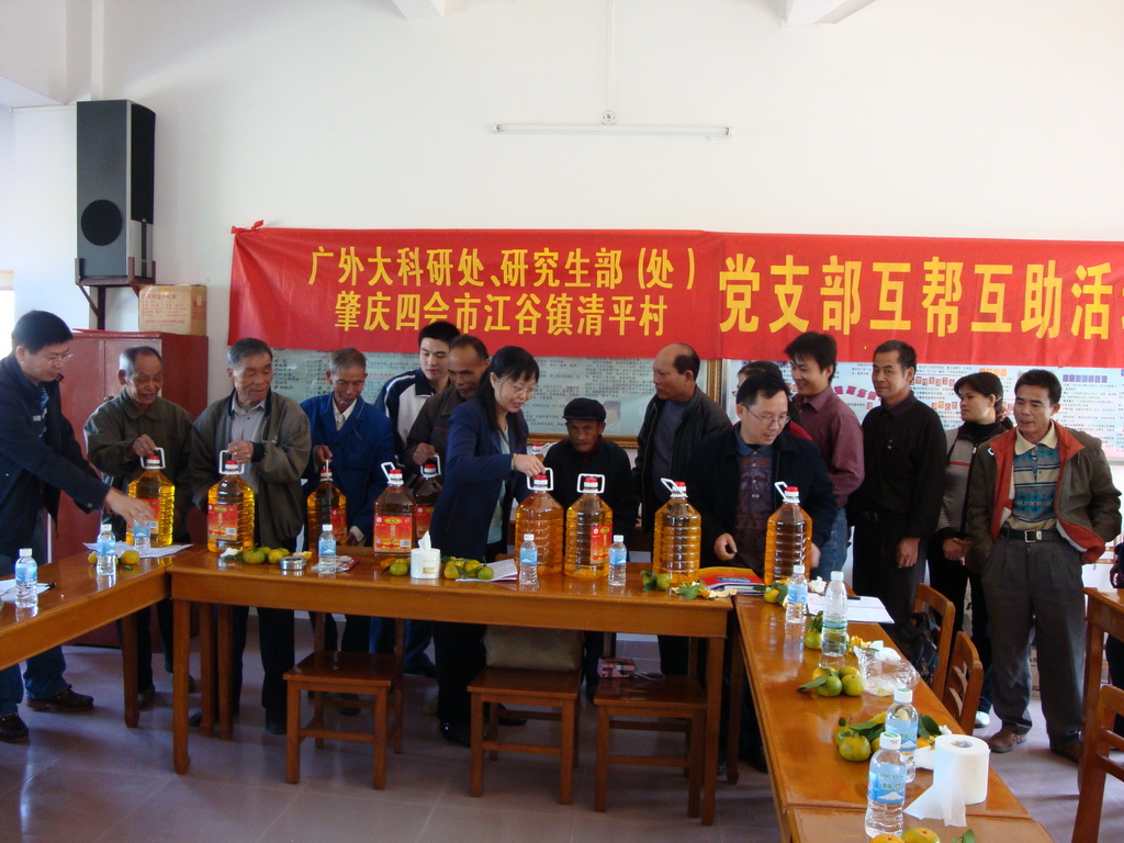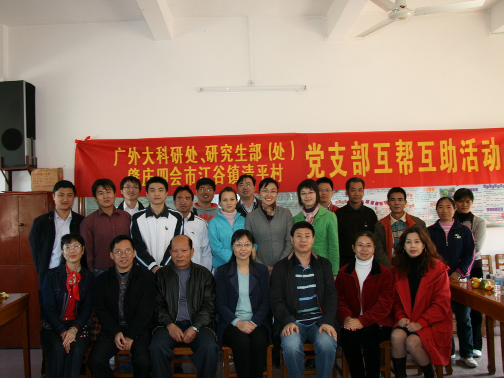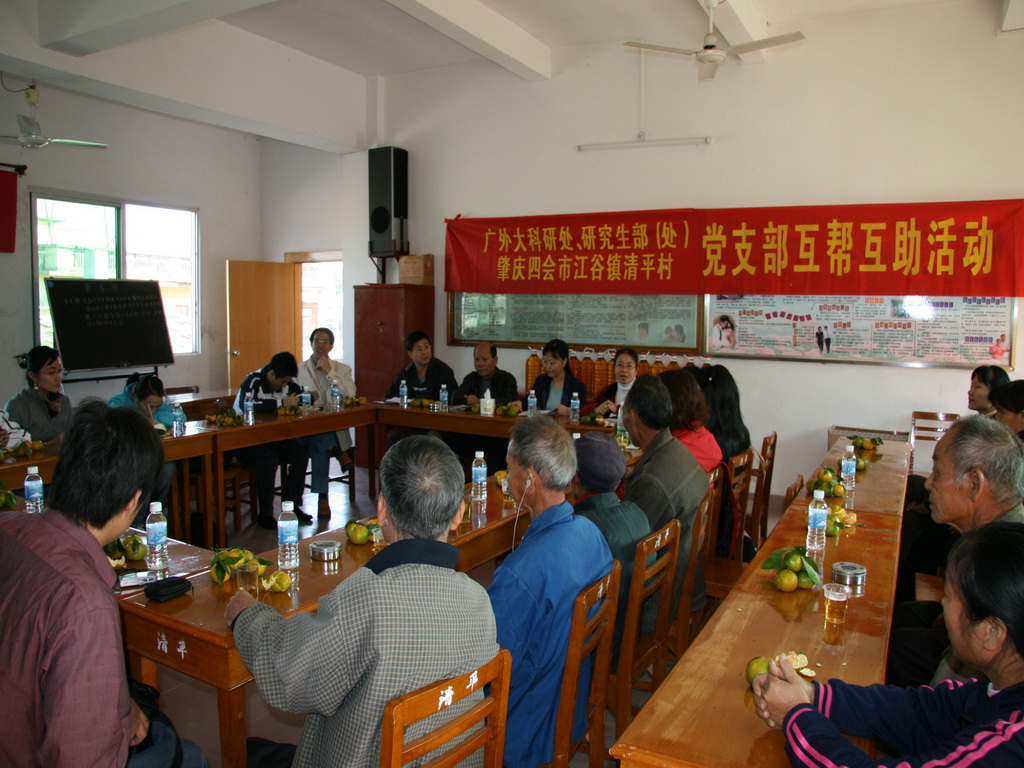 两个党支部与四会江谷镇清平村党支部在清平村村委会议室集中过了“一”次组织生活。陈兆敏介绍了江谷镇的情况,并强调江谷镇要抢抓当前深入学习实践科学发展观大好机遇,以与广外结对子开展城乡互助为动力,千方百计促进本镇发展。顾钊表达了对校两个党支部的热烈欢迎,并简短的介绍了清平村的情况和党支部的建设。
