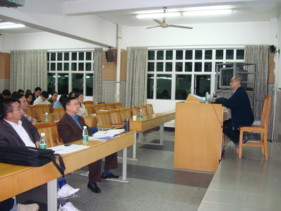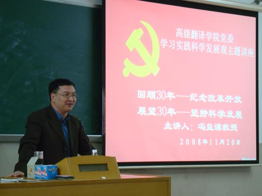 本网讯 为了进一步深入开展学习实践科学发展观活动,贯彻校党委对科学发展观活动中“讲一天”的精神,增强党员的政治觉悟和党性意识,2008年11月20日晚,高级翻译学院在二教132举行“回顾30年——纪念改革开放展望30年——坚持科学发展”专题报告,政管学院冯益谦教授担任主讲。