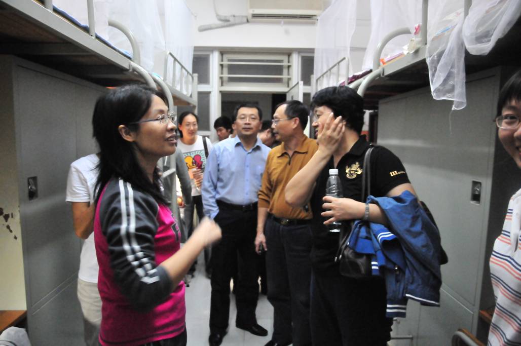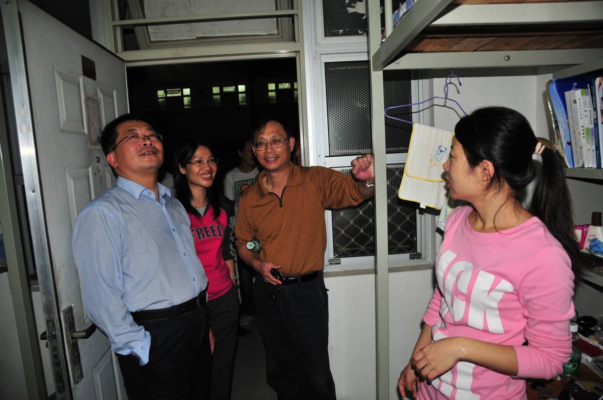 本网讯 11月17日晚,为听取学生对工作的意见和建议,加强学生消防安全意识,管理学院领导一行走访了管理学院学生宿舍,并与同学们进行亲切交谈,询问其生活学习情况。参加此次活动的有该院院长杨晓燕、党委书记刘祎、副院长黄立军、刘中华、党委副书记朱珍葶以及该院学工办的老师。
