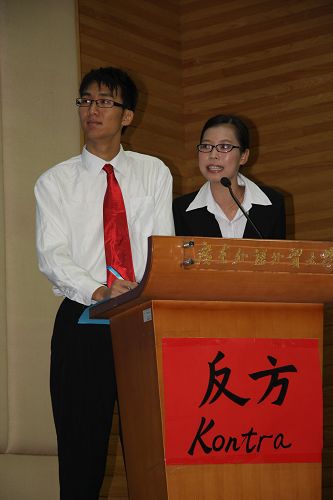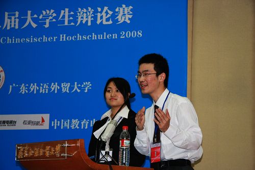 我校参赛代表是西语学院的周全和李文爱。由于主场作战,他们每次出场都备受关注,现场观众总是很慷慨地把掌声送给他们。而他们也没有辜负大家的希望,台上的他们充满自信,德语流畅,观点陈述清晰条理。面对对手的提问和反击,他们表现自如,一路过关斩将,以小组第一的身份直接进入复赛。在随后的复赛和半决赛中,面对咄咄逼人的对手,他们依旧从容镇定,据理力争,最终获得了二等奖。