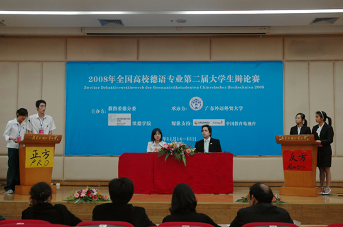 本网讯 11月15日,2008年全国高校德语专业第二届大学生辩论赛在北校图书馆负一层圆满落幕。来自全国各地高校德语专业的学子齐聚一堂。经过两天的角逐,上海外国语大学和北京外国语大学代表队夺得一等奖。我校代表队第一次参赛便获得了二等奖的佳绩。