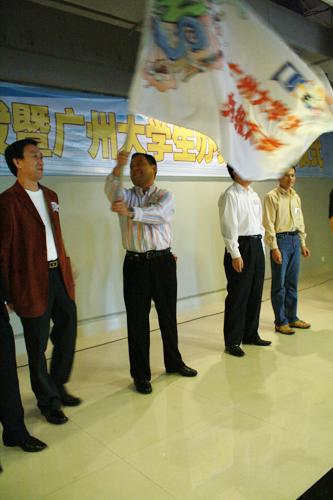 仪式尾声,9所高校宣传部部长上台,举行了极具象征意义的授旗仪式,“广州大学生办报大赛”正式启动。