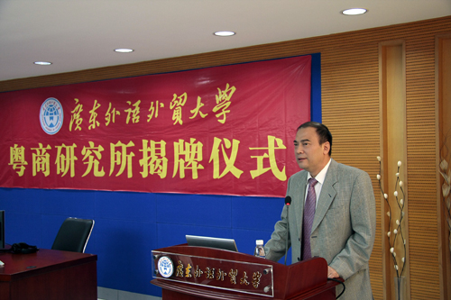 隋广军在致辞中对粤商研究会的成立背景及成立目的作了简要的介绍。他指出,粤商对于中华民族的进步,对于我国与世界的经贸交往,对于中国的现代化做出卓越的贡献。然而对粤商的研究却仍存在极大的空白和巨大的空间。隋广军表示:“对于粤商题材的研究必会成为社会科学一个新的研究热点,而广外粤商研究所的成立也是基于这样的判断。”隋广军还提到,粤商具有强烈的对外性,较少依附政治权利且具有悠久的历史。他强调,成立专门的粤商研究机构,展开对粤商系统性的研究具有重要的社会和经济意义。他说:“尤其在新的历史时期,研究粤商对于分析中国经济社会的发展趋势,实现珠三角产业转移与升级战略具有重大意义。并且也有利于打造我校社会科学优势学科群和我校综合实力的提升”。他指出,目前我省粤商研究力量十分薄弱,希望我校粤商研究所成为研究粤商重要且权威的机构。