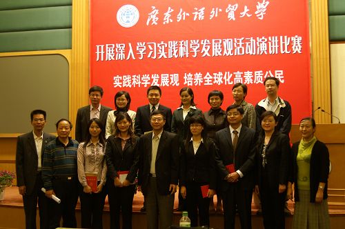 并列一等奖得主、仅有的两位学生参赛选手之一、学生党员苏希露,则从北京大学优秀大学生、世界文化交流青年使者郭晓春的经历出发,结合大学期间自己所参与的课程、活动、比赛的收益,探讨了在全球化的背景下,中国的大学生如何去成为具有国际能力的高素质公民,如何把科学发展观与大学生的教育结合起来,挖掘自己的创新能力,争取成为优秀青年。她表示,实践科学发展观,要培养的就是像郭晓春一样全球化、高素质的人才,广外像是一个宝库,为学生提供了成才的机会,让学生与世界连在一起,给了她展示的舞台,她“为自己是广外学子而骄傲。”苏希露也在演讲中表示,学生要培养独立思考能力、创造和想象力、动手实践能力,还要提高文明礼貌方面的修养。她的整个演讲沉稳而不失活泼,严肃而不失生动,展现了广外学子的风采。