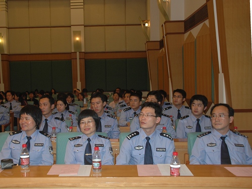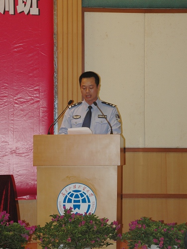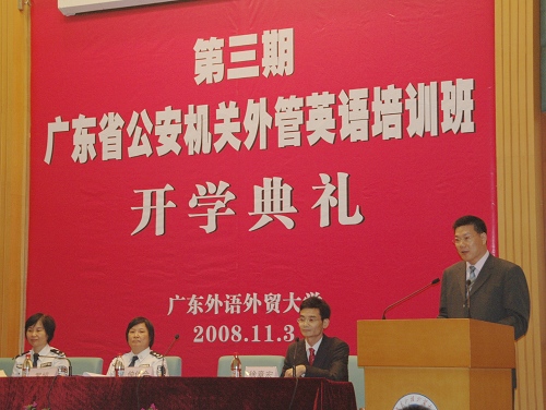 本网讯 11月3日下午,我校与省公安厅合办的广东省公安机关第三期外管英语培训班开学典礼在北校区国际会议报告厅隆重举行。广东省公安厅副厅长罗娟、我校副校长仲伟合、广东省公安厅出入境管理局副局长莫廉、商英学院院长平洪、商英党委书记谢应东及其他相关领导和老师、广东省公安机关第三期外管英语培训班学员和商英学院英语(国际经济法)06级学生出席了本次开学典礼。典礼由商英学院副院长徐章宏主持。