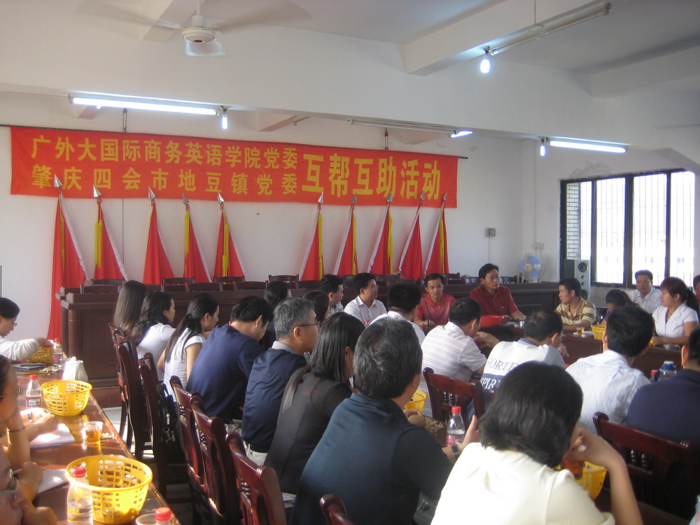下午三点,在镇政府会议室举行了肇庆四会市地豆镇党委与广外商英学院党委互帮互助活动启动仪式。地豆镇镇长郑泰聪,7个村党支部书记,商英学院党委书记谢应东,院长平洪,副院长徐章宏、郭桂杭、朱文忠,副书记骆银花以及教工党员参加了启动仪式。