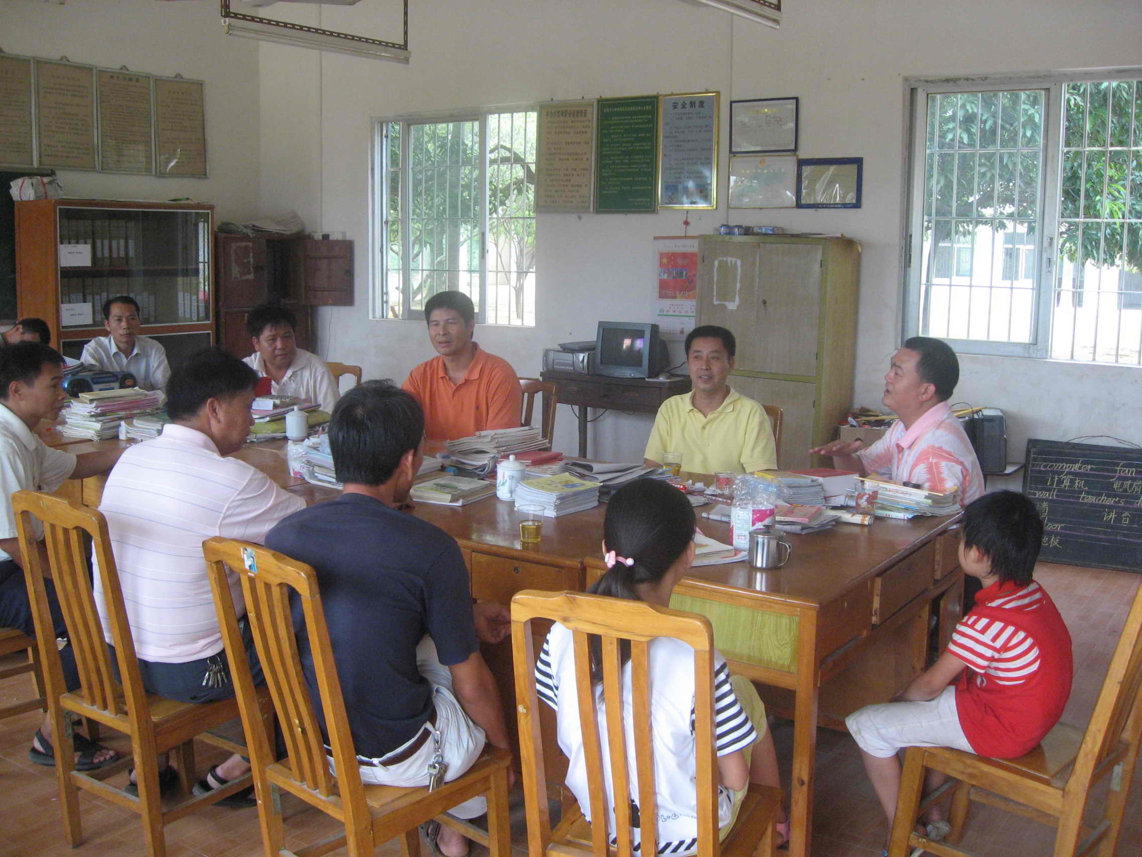 中午,在村小学的教师备课室,丘乐威一行与村委会干部、村小学校长和受资助学生进行了座谈,座谈会由大沙镇的负责同志主持。村支书对村美村的情况进行了详细的介绍后,丘乐威表示,“再穷不能穷教育,一定要尽我们所能为孩子们的健康成长提供力所能及的支持”。了解到村小学的篮球架已经严重损坏,很多学生希望开展羽毛球运动等情况之后,李旭武表示一定尽力帮忙解决问题。