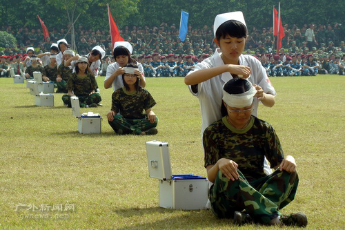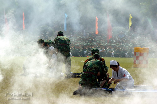 我们是广外骄子(图/实习生 杜彦玲) 消防演练同样赢得了热烈的掌声,面对凶猛的火势,由管理学院90多名同学组成的消防小组沉着应对,技术娴熟,动作敏捷。紧接着运动场上出现了一批白衣天使。救护人员灵活地转动手中的纱布,运送人员迅速迈开自己的步伐,向在场的领导、教官、老师、同学汇报了军训的成果。
