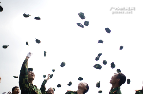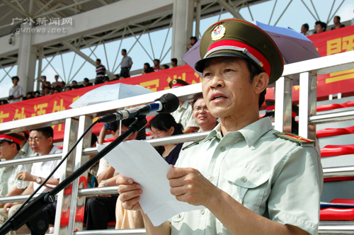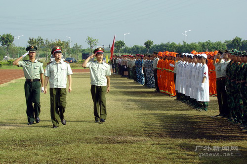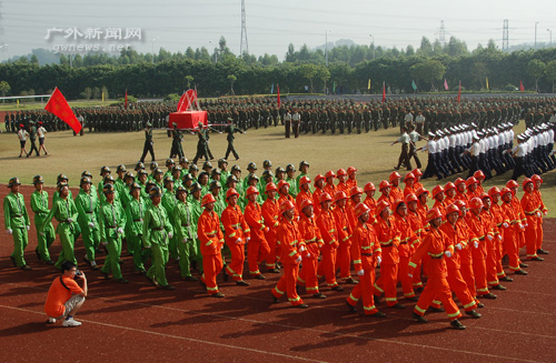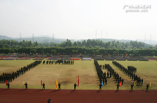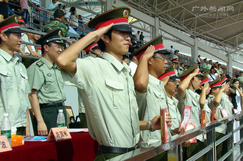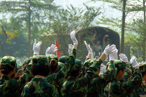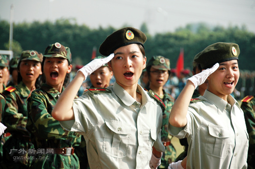 本网讯 9月20日上午,我校2008级新生军训汇报表演暨总结表彰大会在南校区运动场上隆重举行。广东省军区动员处副处长宋纯武,广东省教育厅体卫艺处科长侯波,广州警备区政治部副主任王春,番禺区武装部部长蒋君武,白云区武装政工科科长唐栋福,武警广州指挥学院副院长刘奇,武警广州指挥学院副政委张军宁,我校党委书记徐真华,校长隋广军,军训领导小组组长、校党委副书记许国彬,副校长陈子锐,知名校友王辉耀等观看了汇报表演。