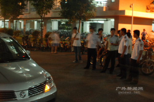 13栋的宿管咨询处也前后接到十几二十名学生的投诉,值班的宿管也于晚上8点多向保卫处反映了情况。接到投诉后,保卫处的人员马上赶赴现场了解情况,由于周围没有其他人员住宿,他们推测车主是一名学生,并设法找到他,但是车主迟迟未能出现。