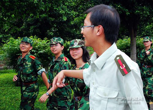 十一连七排中出现了一个身穿军装的“新兵”,他就是来自07法学外交班的孙行,一位代理班主任。他不时照顾着体力不支的同学,来回奔走在队伍前后在为落后的人打气。他不仅带头唱起嘹亮的军歌,鼓舞着队伍的士气,还沿途介绍各个学校的特色和趣闻,把同学们的注意力从疲沓的步伐中转移出来。