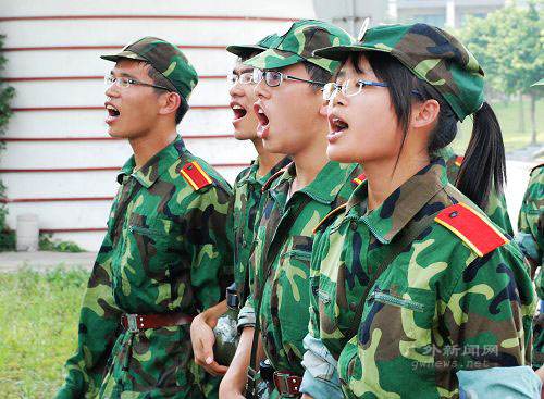 拉练进行到中途,三点钟的太阳依旧火辣。大家开始疲劳,开始懈怠,步伐也愈发沉重。这时,行进队伍中开始响起歌声。除了最耳熟能详的军歌《团结就是力量》、《打靶归来》、《军纪如铁》外,也有新生们唱出新意,《对面的女孩看过来》《朋友》,甚至还有英文歌也从队伍中传出。