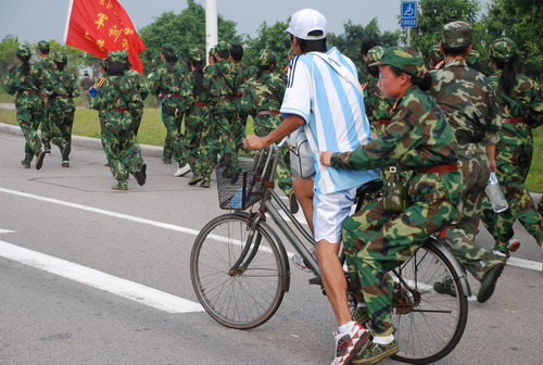 在跟跑的过程中,记者见到有身上挂着七八个水壶而脸带灿烂笑容的代理班主任,有用单车充当“急救车”不辞劳苦接送新兵的志愿者。