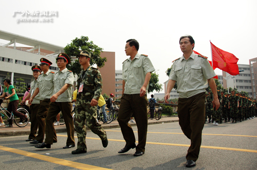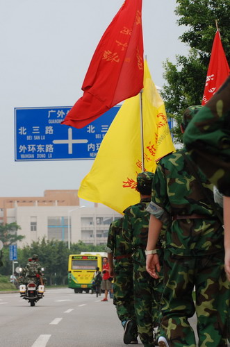 本网讯 9月11日下午2:20,随着学校军训领导小组组长、校党委副书记许国彬的一声“出发”,2008年新生军训环大学城越野训练正式开始。在许国彬、军训旅旅长王广、军训旅政委钟罗军、植秀聪、副政委杨敏生、副参谋长邹春权六人的带领下,南校区军训旅共四营14个连3850名新生气宇轩昂、意气风发地踏上中环路的拉练之旅。
