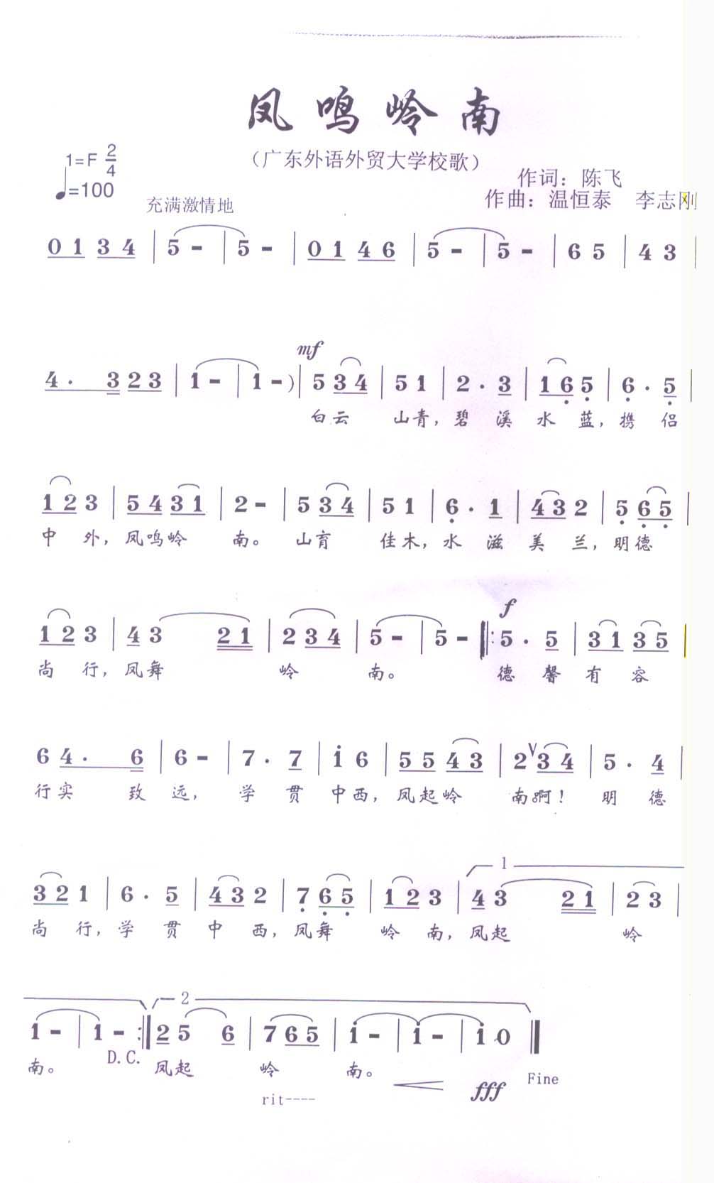 1、“凤鸣岭南”,为校歌主题。“凤”即凤凰,在中国文化里,是吉祥神瑞之鸟,是中国南方的图腾;“有凤来仪”是吉祥之兆、成功之象;凤凰择木而栖,比喻优美环境和优秀人才之间的互相吸引。广外大(以下简称我校)北校区校园,依山傍溪,是为宝地,形如凤凰展翅。南校区有“凤凰山”。因此用“凤凰”比我校,可谓意象优美,形神兼备。