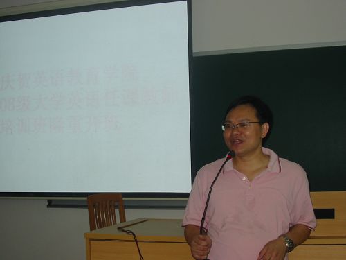 在开班致辞中,刘建达首先肯定了英语教育学院在大学领导下为制定08英语教学计划所作的努力,指出落实新教学计划是大学本科教学工作的重要组成部分。他表示,新生入学参加分级考试、大学英语实行分级教学,是凸显我校大学英语教学特色的关键。他还强调此次培训的重要意义,并祝培训取得圆满成功。