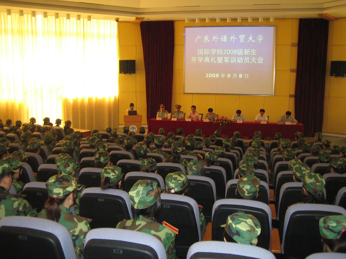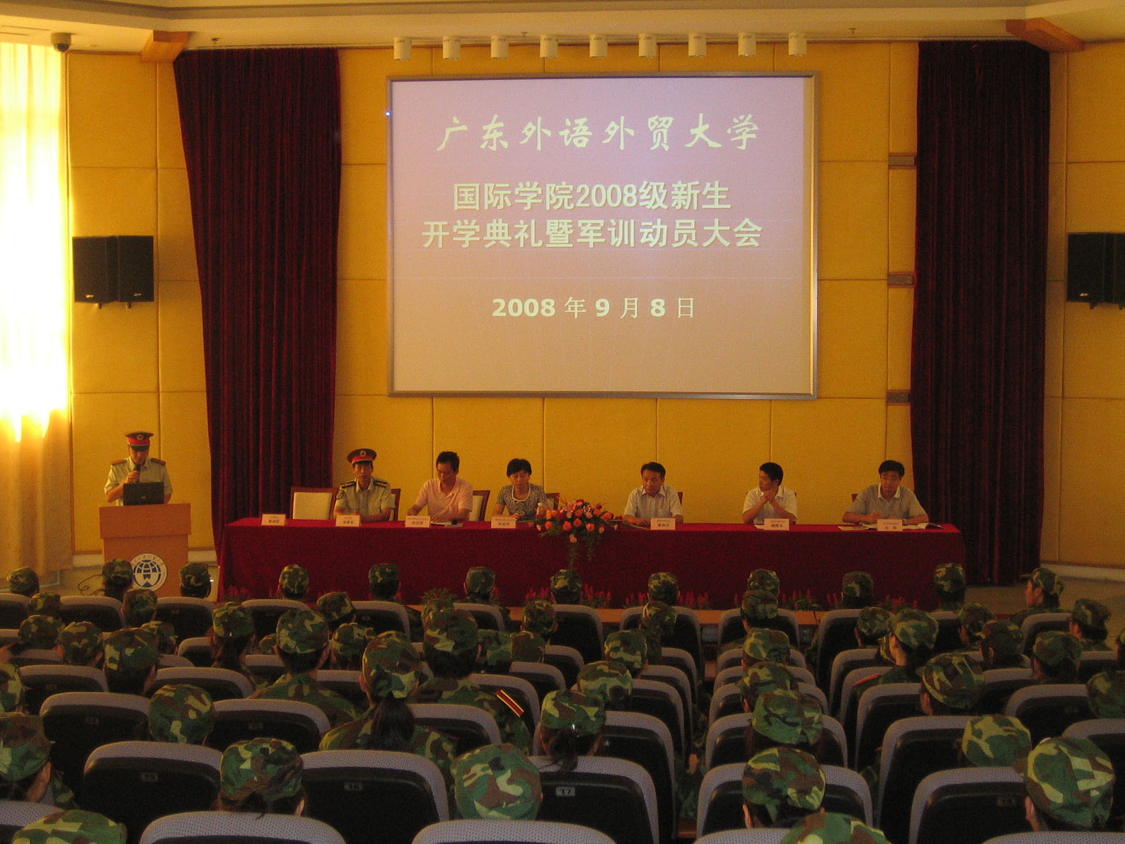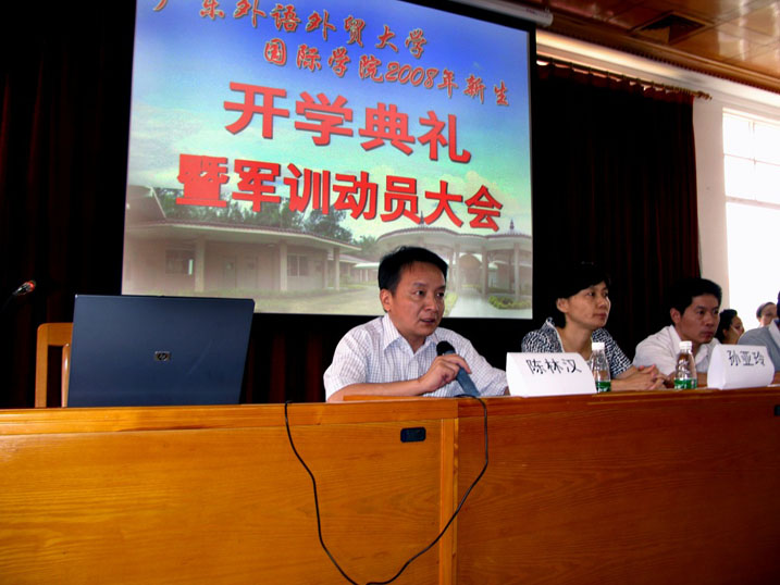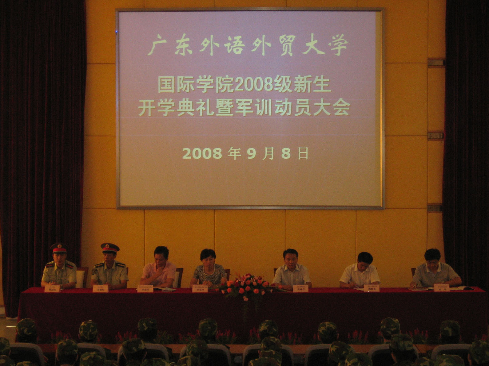 本网讯 9月8日,国际学院2008级新生开学典礼暨军训动员大会在南北校区分别举行。国际学院院长陈林汉、党总支书记孙亚玲、副院长魏辉良、刘明、党总支副书记林茂辉,军训营营长邹春权、蔡超乾以及辅导员等出席大会。大会由林茂辉主持。