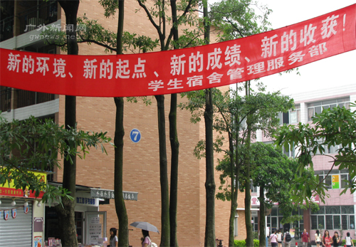 宿舍区校道上悬挂的标语(图\林惠娟)