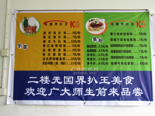 而“学生第二饭堂”的牌子上边新挂的“无国界扒饭、意粉”宣传牌也引起了不少同学的注意。饮食服务部经理李建丰告诉记者,他们一直都有在二饭开设无国界连锁店的想法。“目前还有一千多名学生有在校外就餐的习惯,但校外的饮食安全没有保证,存在饮食安全隐患。所以我们希望通过丰富饭菜种类,方便吸引更多的学生就餐,这都是从学生利益的角度出发而决定的。”李经理还介绍,二饭的无国界扒饭和意粉中饭和晚饭时间都会供应,而且种类较多,价格合理。目前所需器具与食材已经运到,将于不久后开业。