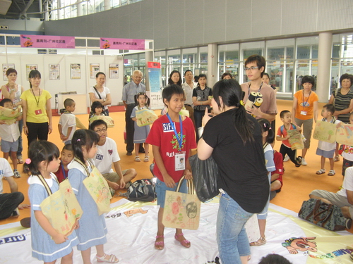早上9点,广州慧灵一校的11名智障儿童在广外SIFE和经贸志协队员的帮助下来到会展中心,组委会事先安排好环保袋和颜色笔。当主持人宣布大家可以下笔的时候,慧灵一校小朋友都急不可耐地画下心中的环保图案。