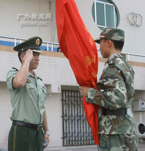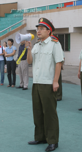 下午四点,教官、学生身穿军装依次入场,一切就绪后,军训旗交接仪式开始。在北校区,五营十五连至十八连的连长们分别接受该连军训旗。南校区则由军训旅旅长王广代表武警广州指挥学院,从军训组组长钟罗军手中接过军训旗。至此,08级新生军训正式拉开序幕。