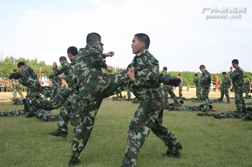 随后擒敌拳方阵的精彩表演,更是引起了热烈的反响。教官们嘹亮有序的报数声,刚劲有力的拳法,两两互搏的表演,现场演示的擒敌招式带动了现场热烈的气氛——“摔擒”“顶摔锁喉”“夹颈别肘”“掀腿压顶”……一系列表演尽展军人本色,赢得了现场的喝彩。