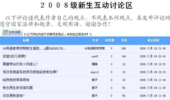 “老生”除了在Q群上发挥作为师兄师姐的影响力以外,有的还在新生讨论区上发《致08级的新同学》《给大学新生——足够你用四年的86条金玉良言》《新生必备(生活用品+学习用具+证件)》等励志性或实用性强的帖子,提前为新生指点迷津,同样得到不少新生的支持和青睐。