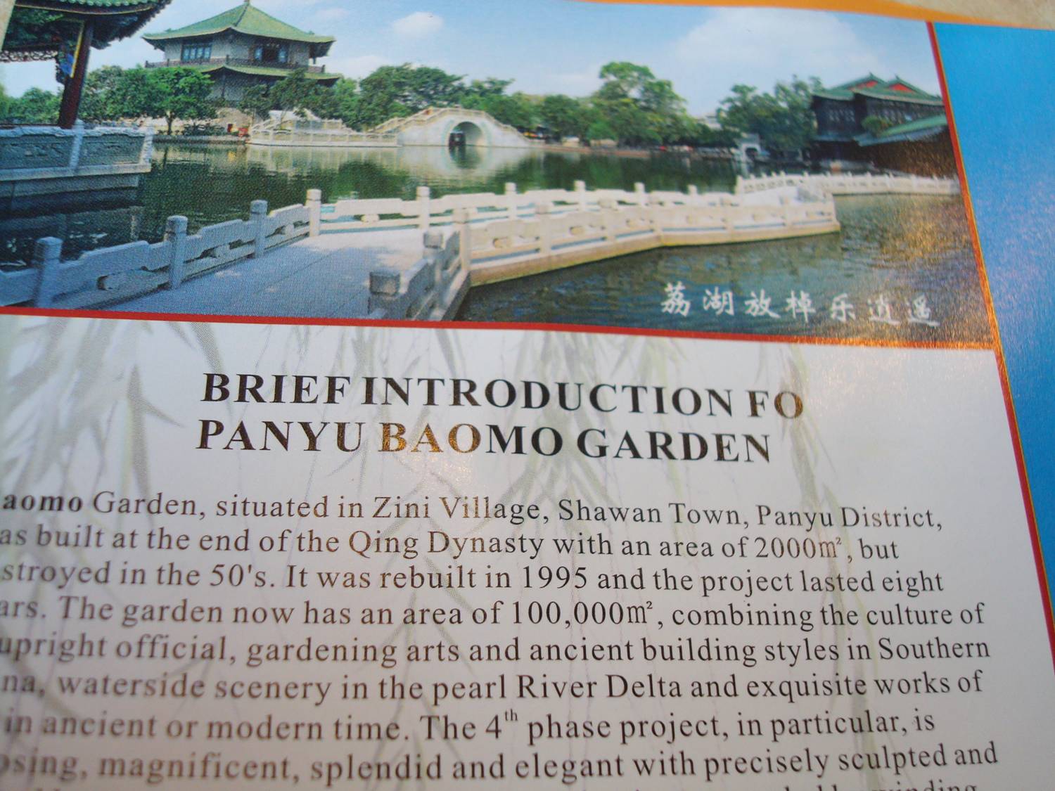 宝墨园是明德队进行实地考察的目的地之一,其位于番禺沙湾镇紫坭村,建于清末,占地五亩,毁于五十年代。一九九五年重建,历时六载,扩至130多亩,集清官文化、岭南古建筑、岭南园林艺术、珠三角水乡特色于一体,建筑、园林、山水、石桥等布局合理、和谐、自然,构成一幅幅美丽壮观的景色。它是著名的旅游景点,其标示语的正确性就显得尤为重要,故该队选择了宝墨园。