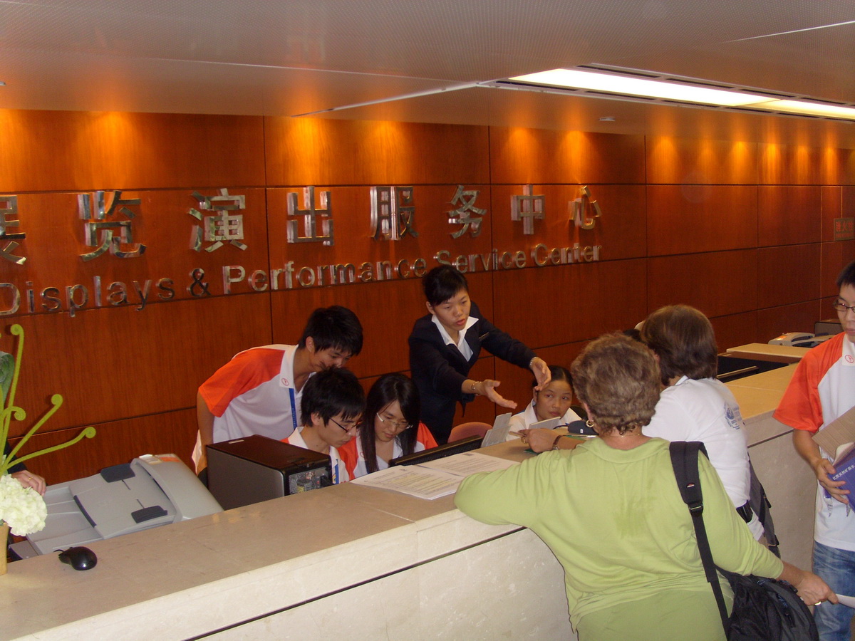 志愿者的工作柜台设在酒店的大堂,由于前台设计问题,空调的作用不大,柜台内非常闷热,但志愿者在繁忙中放弃了喝水休息的时间坚持工作了一天。