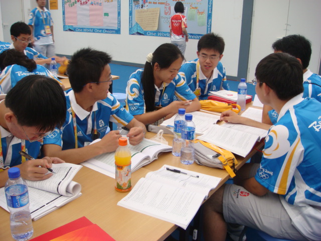 比如说赢取积分的游戏。老师为了提高大家学习的积极性,想出来的招数还真是让人鼓掌叫好。清华的同学自己设计出来漂亮精致的积分卡,大量影印,平时无论是定向越野(看谁第一时间冲到终点,以此来让大家熟悉场馆的每个地点布局),或者是抢答环节(一般考察同学对专有英文词汇的掌握),赢者就能获取积分。最后,一定的积分能免费换取开幕式排练的门票或者水立方独家纪念品。这个游戏一推出,使平时不愿意参与的同学(比如我,老是懒懒地宁愿单独学习培训教材),也被逼打起十二分精神参加游戏。
