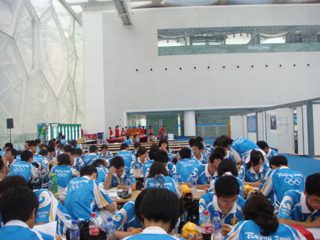 中午吃过午饭之后,和队友再次踏勘以求进一步了解“水立方”各个区域的功能及方位。回来后小憩了一会,之后便开始了今天的惊喜之旅。根据安排,下午一点半到两点半进行场馆英语知识抢答,每道题最先答对者将得到面值十元的“泡泡币”,这些“泡泡币”可在奥运结束后向场馆礼品部兑换奖品。原本大家都昏昏欲睡,但经主持人这么一诱惑,所有人立刻振奋起来,开始翻书做好准备。第一道问题,第二道,第三道……各个小组为了得到“泡泡币”,纷纷使出了浑身解数,有些人负责抢答,剩余的人帮忙起哄、加油!在所有成员的通力合作下,我们小组总共拿下了五道题,从而获得五十元的“泡泡币”。