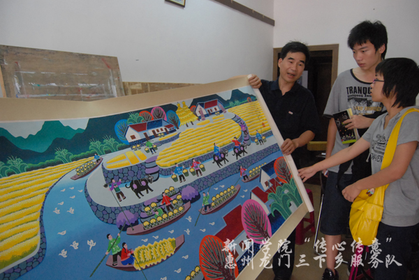 7月19日:兴高采烈之时,农民画家陈权枢为调研组员展示他的得意之作。