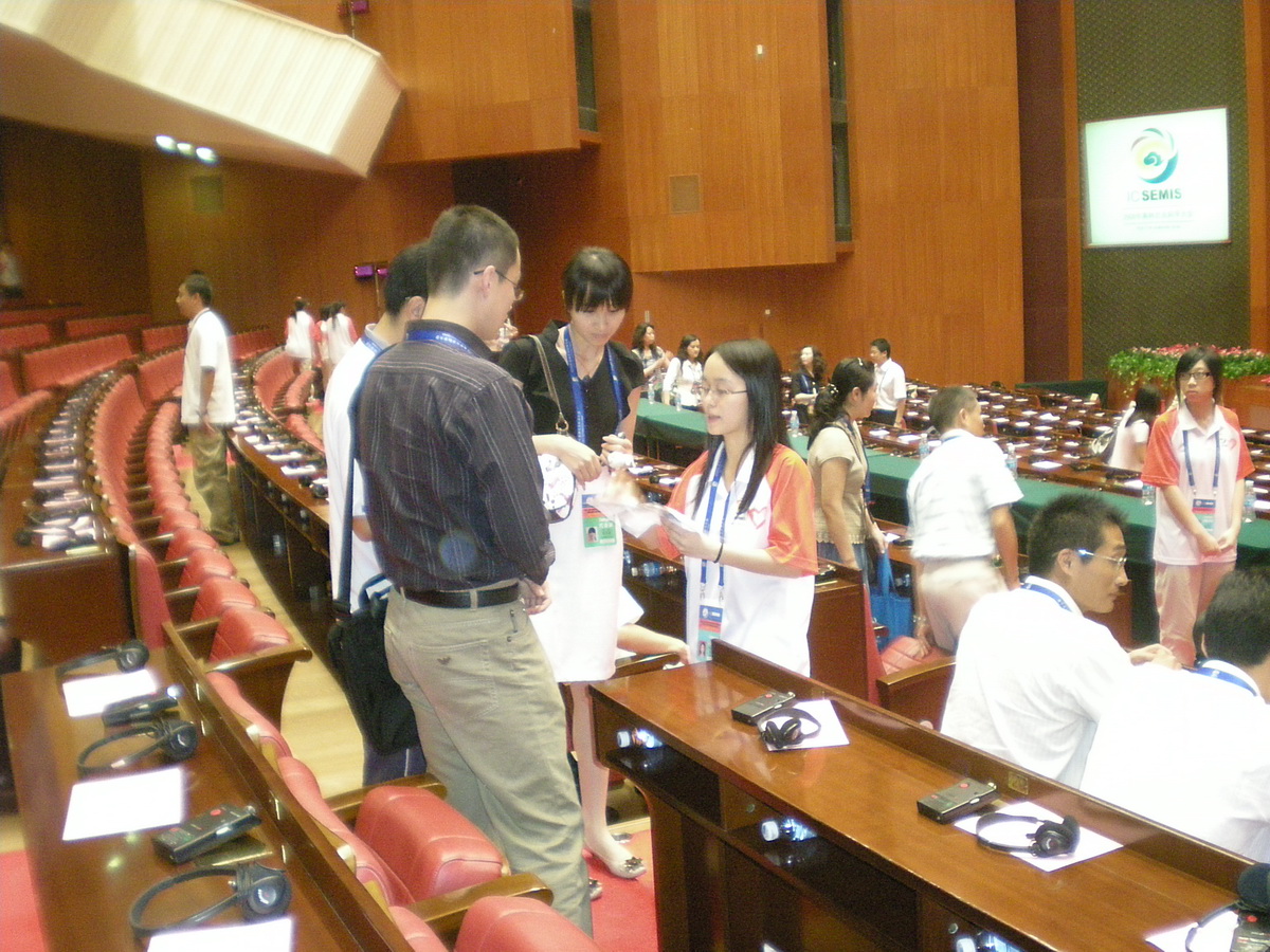8月1日下午,刚从机场结束接待工作口岸志愿者,又马不停蹄地赶回白云国际会议中心投入到开幕式及大会主题报告的准备工作当中。志愿者们为每位代表准备了同声传译耳机和接收器,共计1500多个,并做好与会人员的会场引导工作,在会议结束之后,又进行设备回收、检查和会场清理工作。