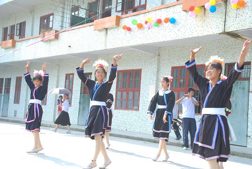 两名队员的葫芦丝横笛合奏也相当精彩,瑶族能歌善舞的女生们还特意为这曲器乐合奏配上了优美动人的瑶族舞蹈。同时高年级同学在队员的指导下献上一曲《半个月亮爬上来》。各班同学也带来各自班歌,进行了一场班歌歌唱比赛。
