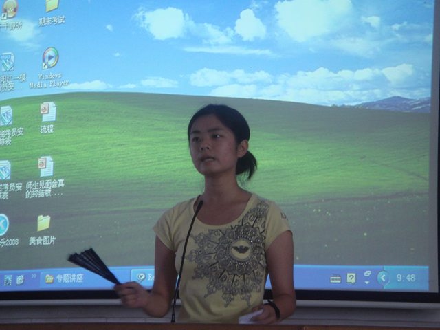 以“说书先生”著称的队员王晓帆老师首先开讲。她凭着自己丰富的奥运知识,摇着那把在四中学生中广为流传的扇子,分别从中国的硬件条件,主观因素,政治因素,投票环节等方面透彻地分析了中国2000年以前申奥失败的原因。此外,王晓帆还借此机会启示学生在哪里失败就要在哪里找原因,要求他们要从北京申奥的历程中学习,要从失败中寻找成功的方法。晓帆老师最后以风趣幽默的一句“欲知后事如何,请听下回分解”结尾,博得场上阵阵掌声。