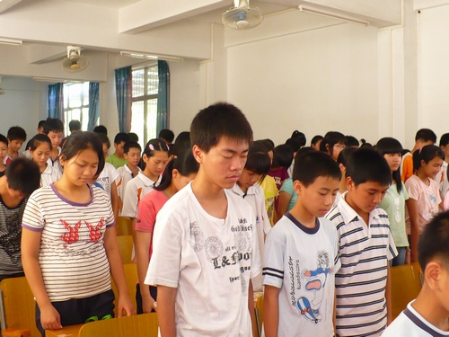 学生在为汶川大地所有震遇害者默哀