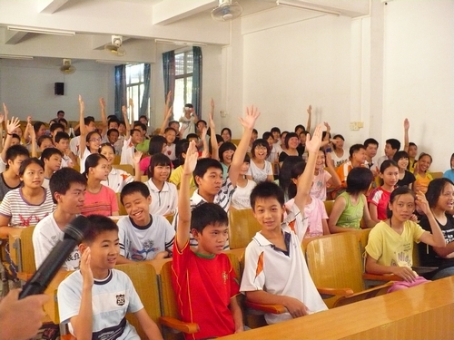 两位主讲人将由群星演绎的地震歌曲《承诺》做为结尾,要求同学们手牵手,跟着一起唱这首歌。全场大合唱《承诺》,再次掀起了讲座的高潮。同学们挥着手,跟着拍子唱, 气氛温馨感人。