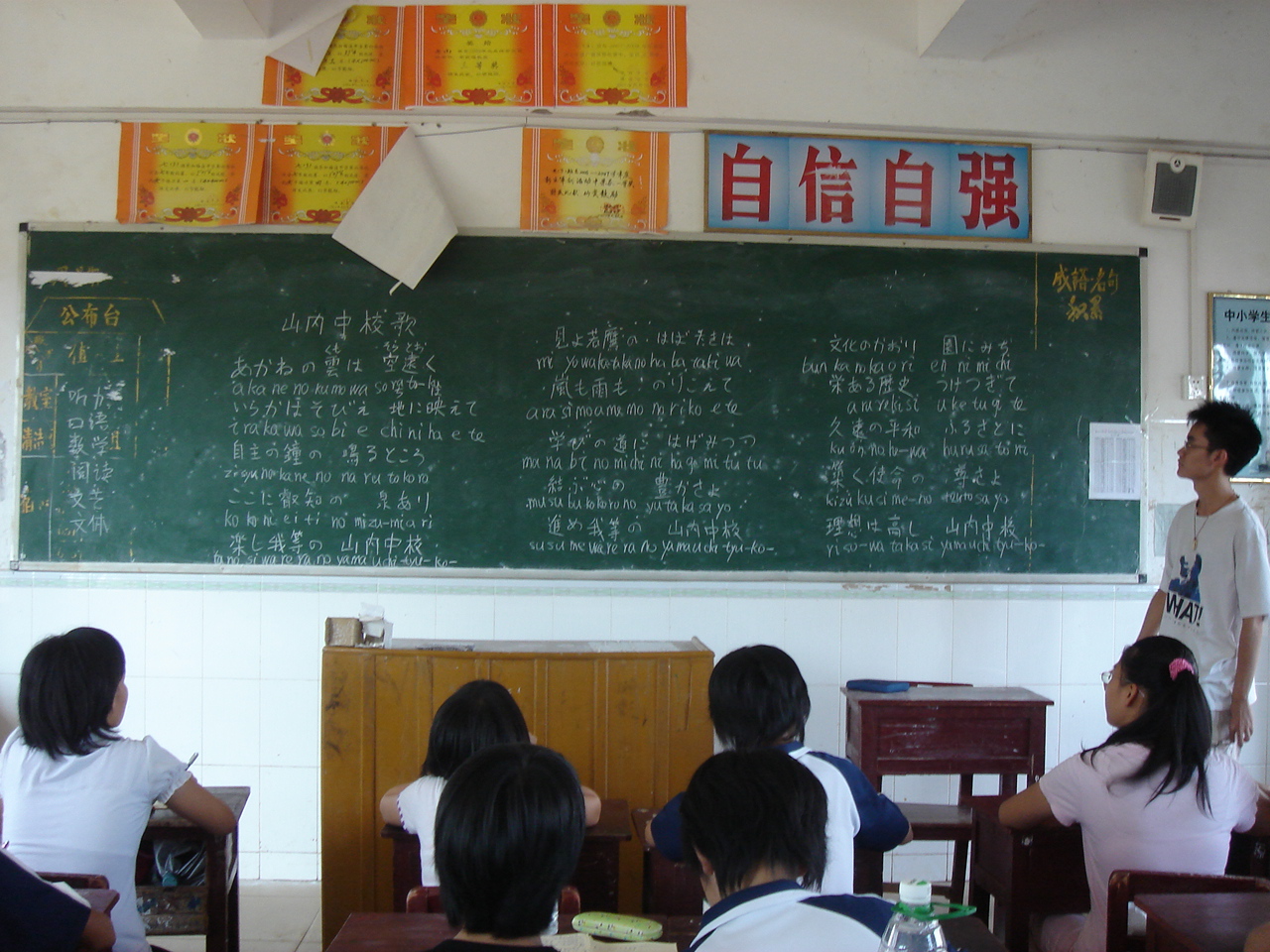 同学们认真地学唱日文歌