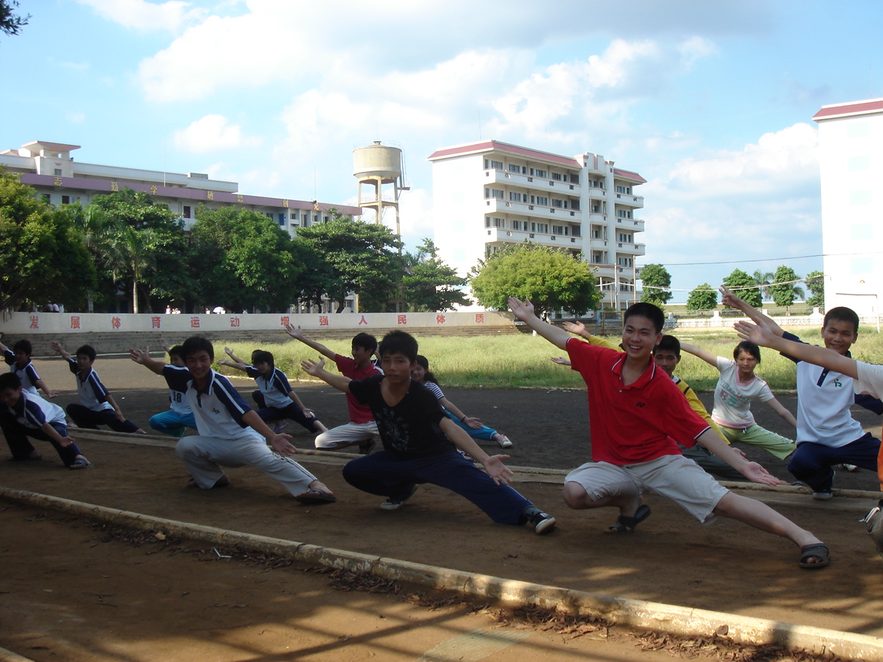 队员蔡玉娟带领学生合着欢快的音乐在操场的另一端跳着健美操。同学们都沉浸在充满韵律的音乐,动感的健美操中。