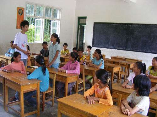按照华敏希望小学的学生规模,义教组队员把学生分成了三年级、四年级和五六年级三个班级,各个班的班主任也是各出奇招来凝聚自己的班级:三年级班主任把教室的桌椅布置成了U形,自己站在中间授课,让同学们更近距离地和自己交流;四年级的班主任则把桌椅摆成了两两相对而坐,目的在于促进大家互相交流,培养合作意识;五六年级班主任则根据高年级同学英语基础较好而采用了靠英文小游戏授课。